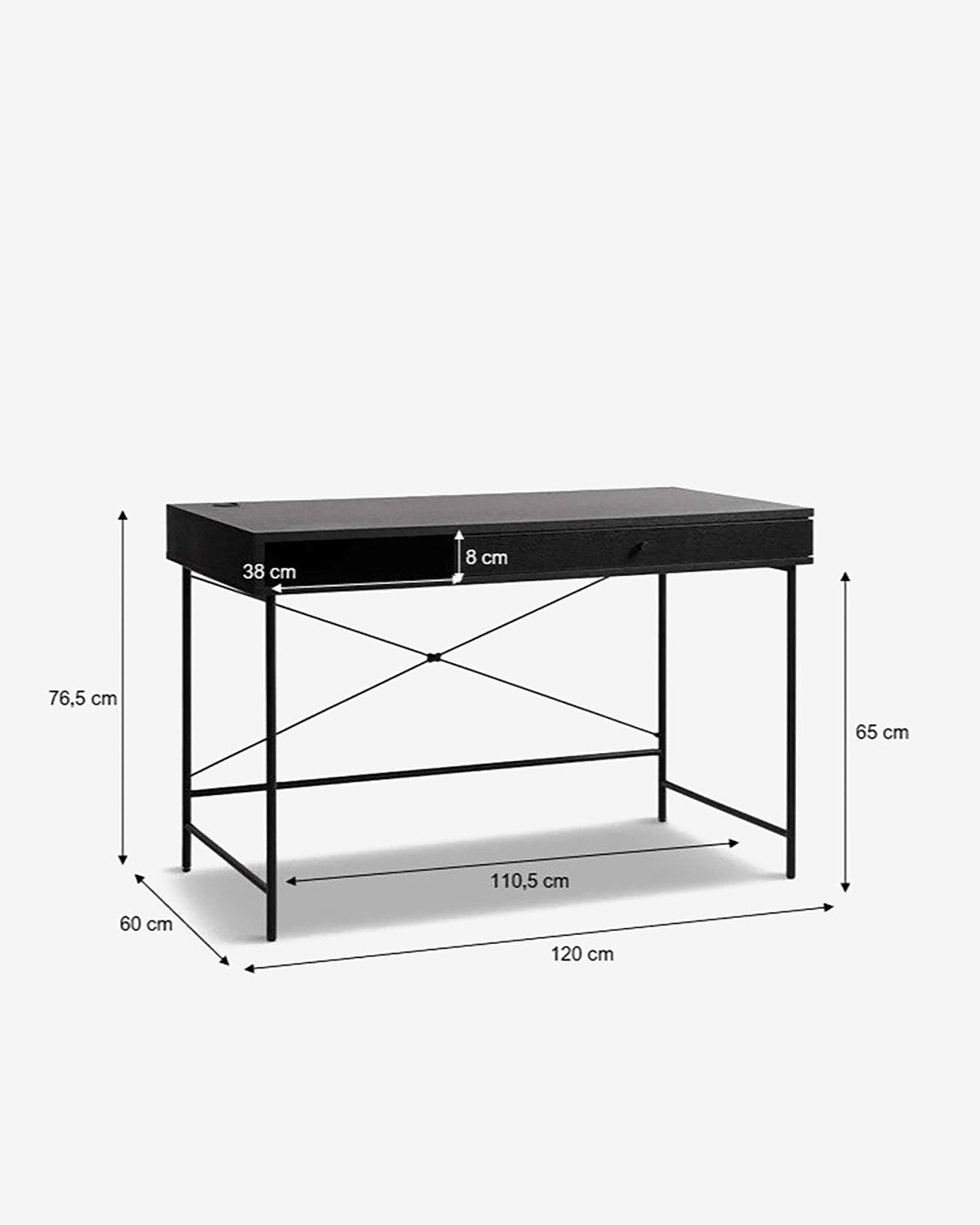 Flot og moderne skrivebord i sort med høje slanke ben, der giver det et enkelt look. Alva skrivebordet fylder ikke meget, så her kan du nemt få plads til en lektie- eller hjemmearbejdsplads.