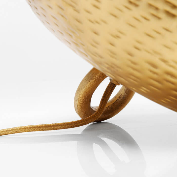 Gulvlampen er udført i messingbelagt stål, der giver et meget blødt og hyggeligt lys, og med sin hamrede overflade ser lampen ud som om den er hjemmelavet.