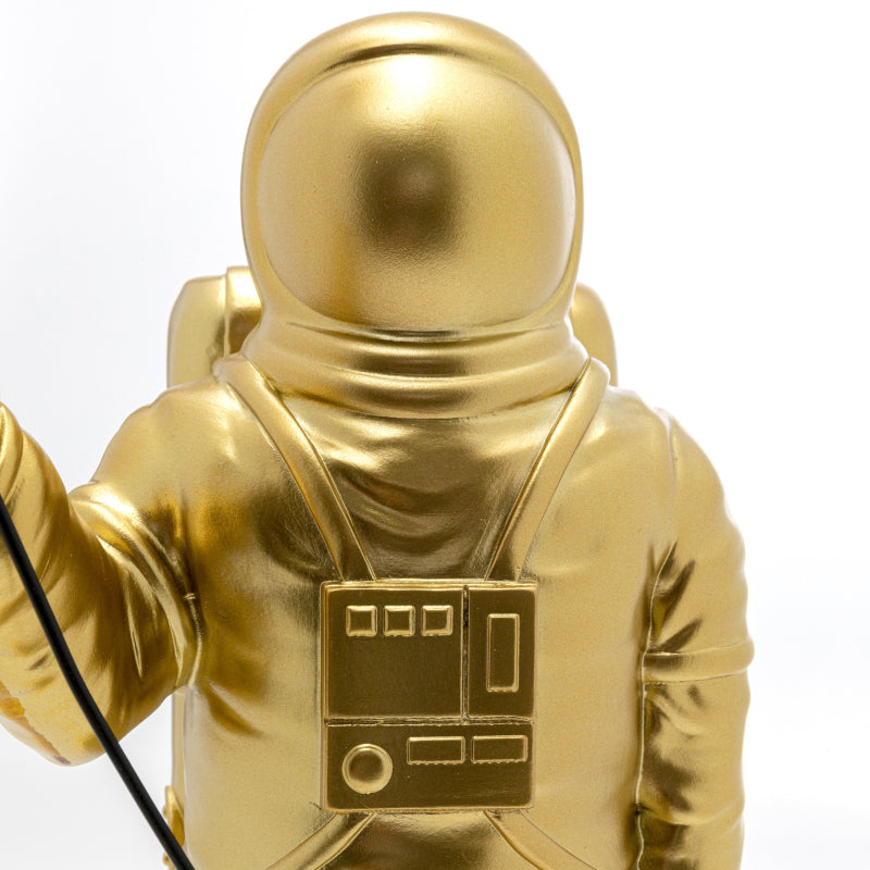 Sjov og dekorativ astronaut med et ballonhjerte. Astronauten er guldfarvet og holder en sort ballon.