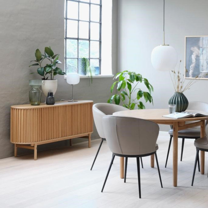 Carno spisebordet med sin smukke runde facon og lakeret eg finer skaber en atmosfære af komfort og hygge.