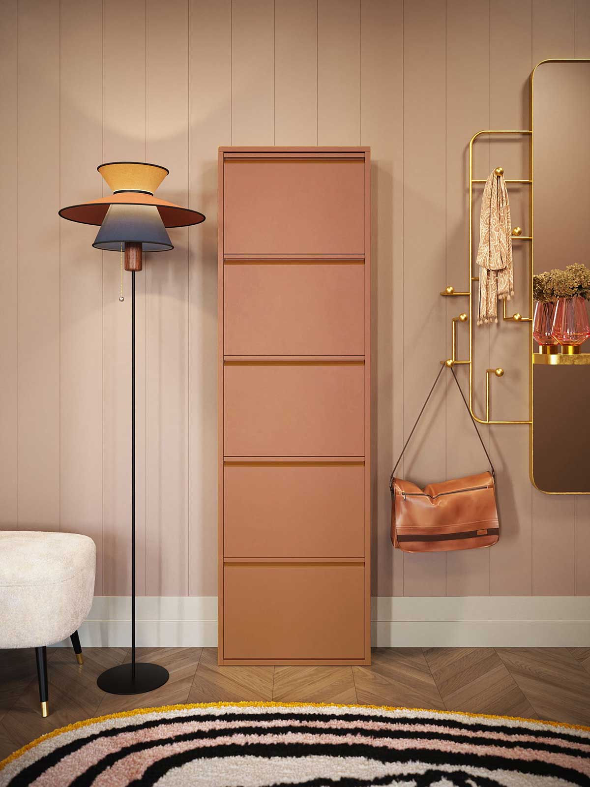 Caruso Skoskab i pulverlakeret stålplade og attraktiv lakeret brun farve. Bag de fem låger er der plads til opbevaring.