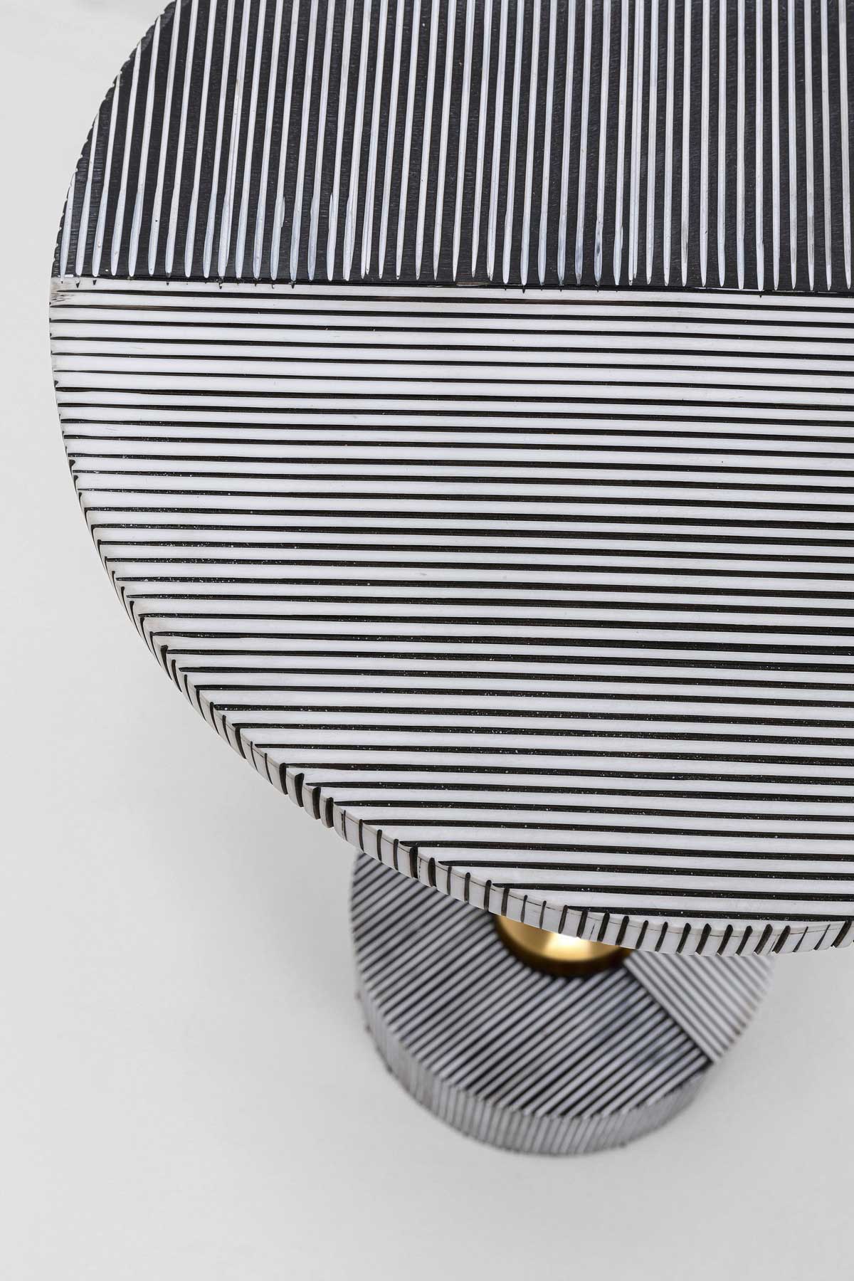 Domero Double sidebordet kombinerer sort og hvidt mangotræ i et markant stribemønster, hvor lodrette og vandrette linjer mødes på midten af bordpladen. Resultatet er et grafisk og moderne udtryk, der tilfører karakter til rummet.