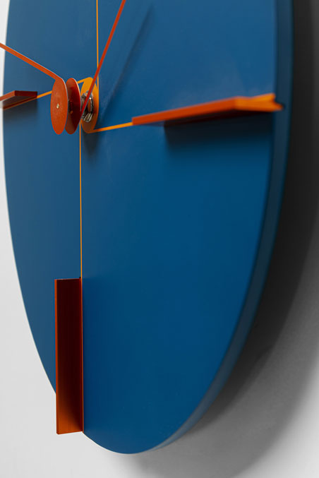 +Grafisk farvekombination: Blå skive og orange visere skaber et levende udtryk