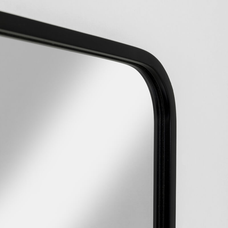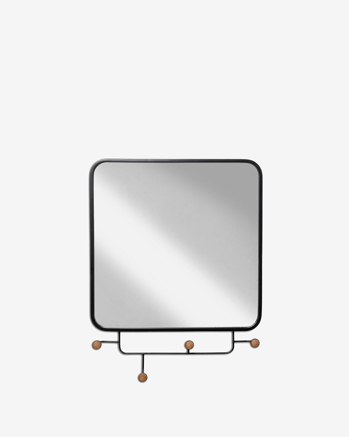 Entré spejl med sort lakeret stål ramme samt knager i massivt træ.