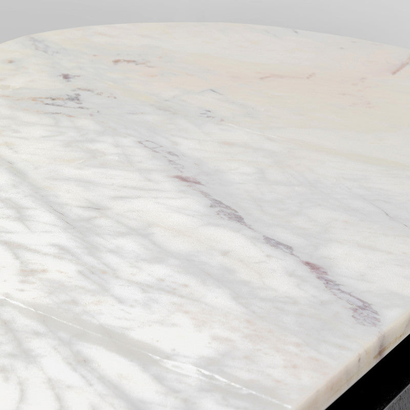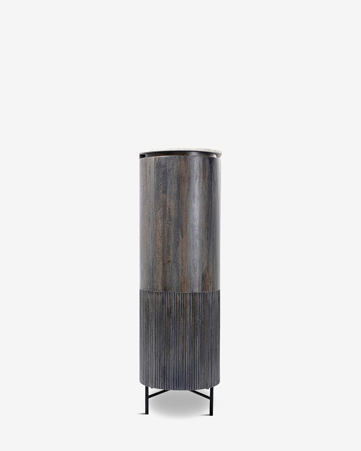 Det høje flotte Glenn vitrineskab er et meget dekorativt vitrineskab i sort mango træ og hvid marmor top med sorte ben.