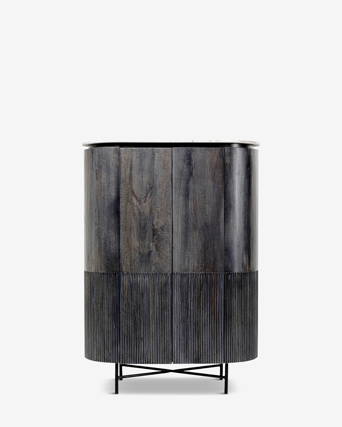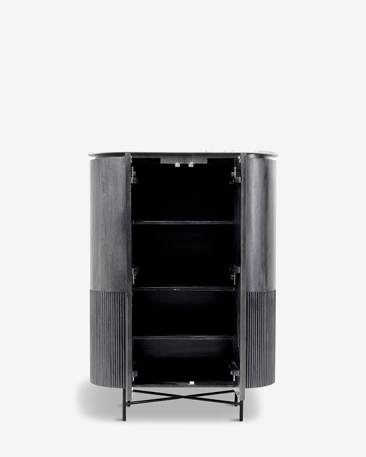 Det høje, flotte Glenn vitrineskab er et meget dekorativt møbel i sort mangotræ og med hvide marmor-detaljer.