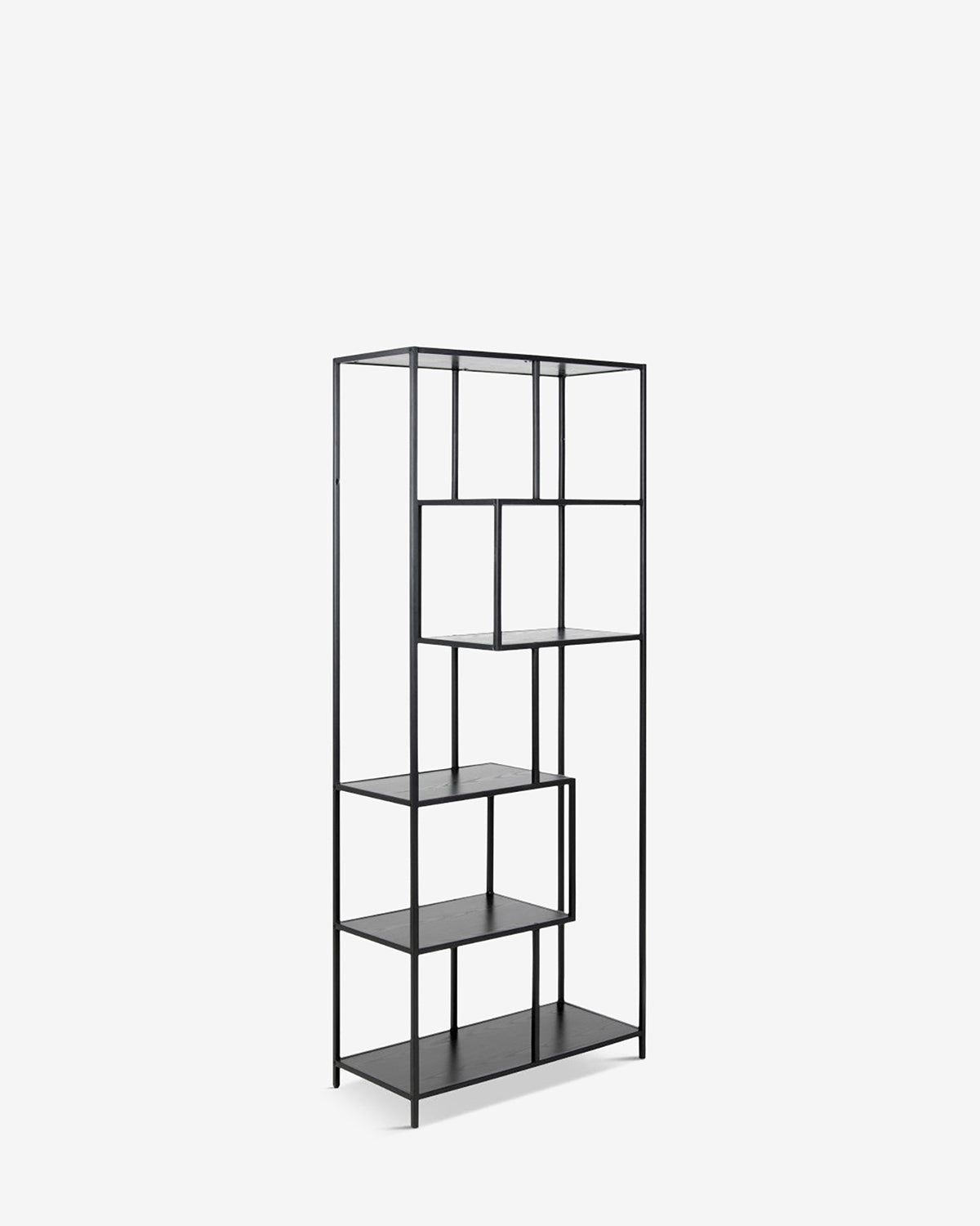 Høj reol i meget dekorativt og stilrent design. Hylderne er udført i sortmalet ask, og stellet er i matchende metal.
