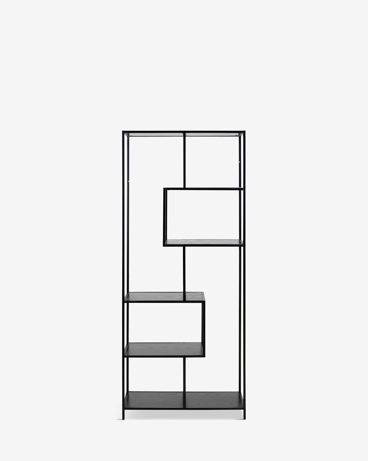Høj reol i meget dekorativt og stilrent design. Hylderne er udført i sortmalet ask og stellet er sortmalet metal, hvilket giver et smukt og moderne look.
