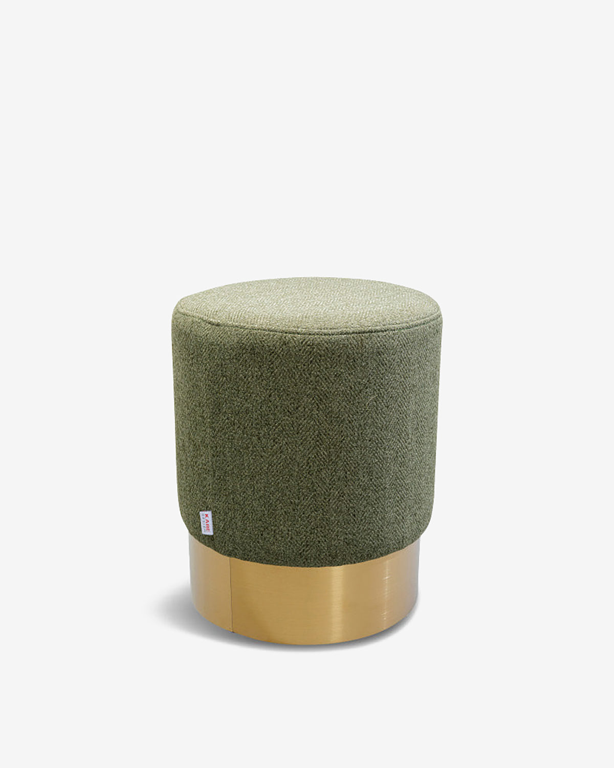 Fin og elegant, farverig rund puf med bløde former i rosa, monteret med et smart, rundt messingfarvet stel.