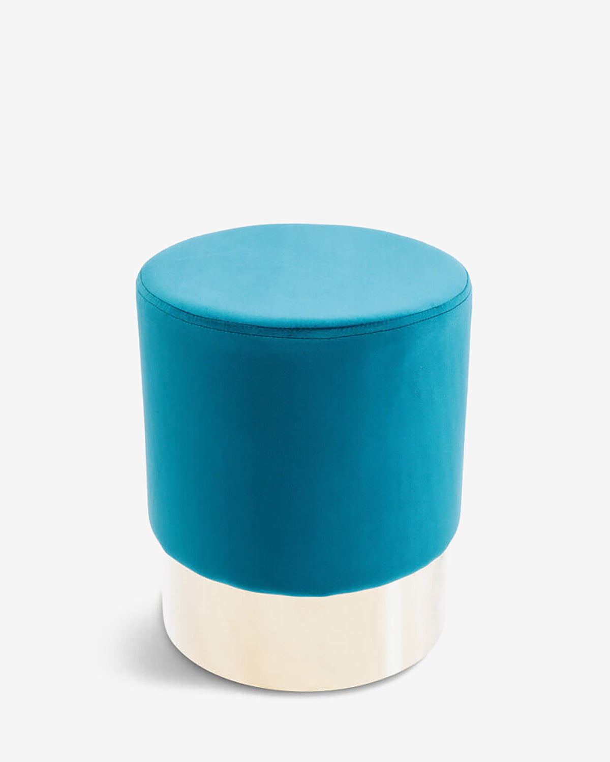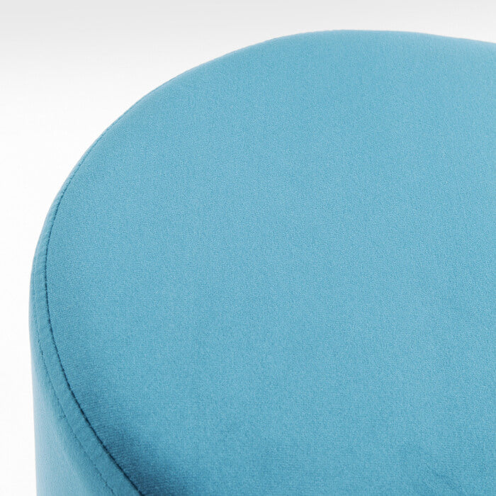 Fin og elegant farverig rund puf med bløde former, dejlig blødt velour lignende stof i turkis og med smart rundt messingfarvet stålstel.