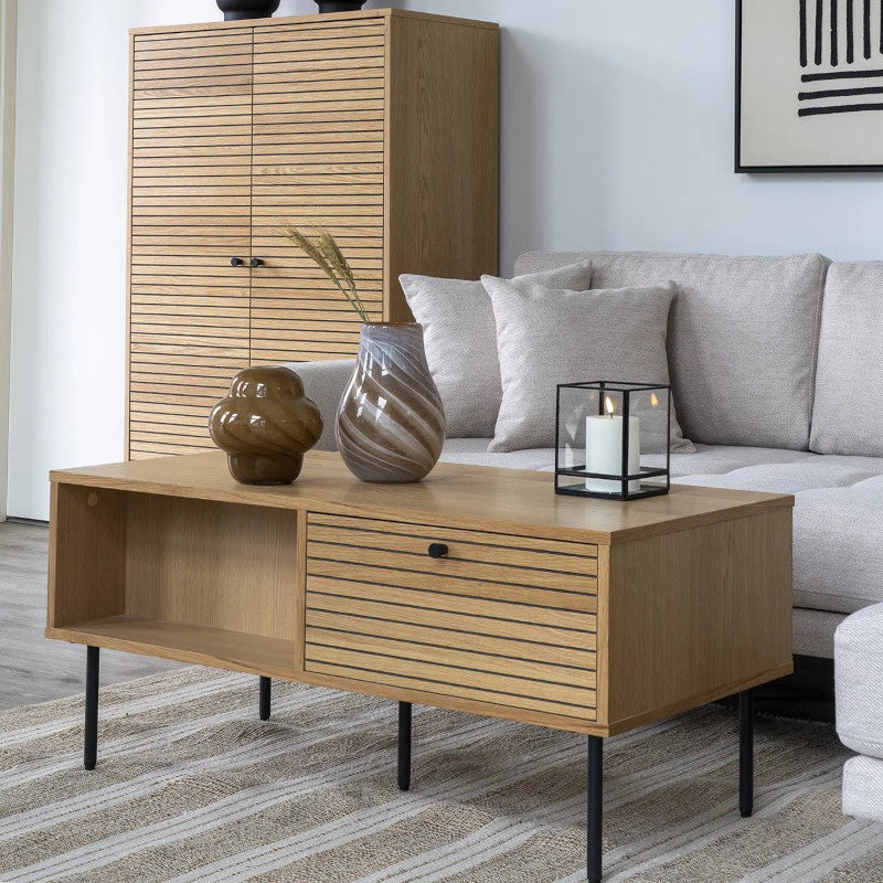 Bordet har en praktisk skuffe, der giver dig mulighed for at opbevare småting som fjernbetjeninger, aviser og andre nødvendigheder, så dit rum forbliver ryddeligt.