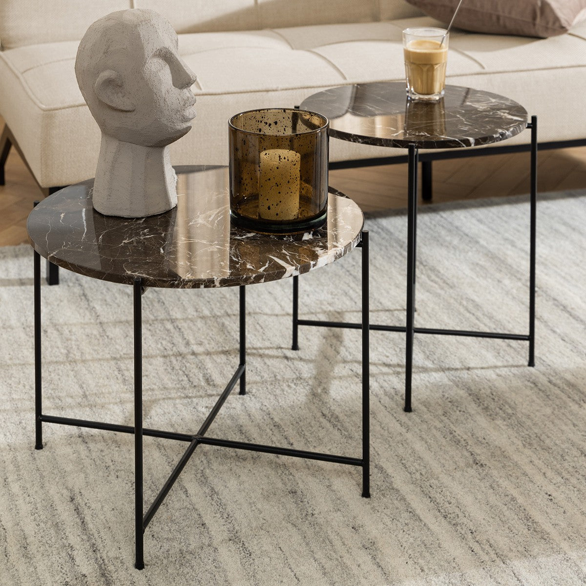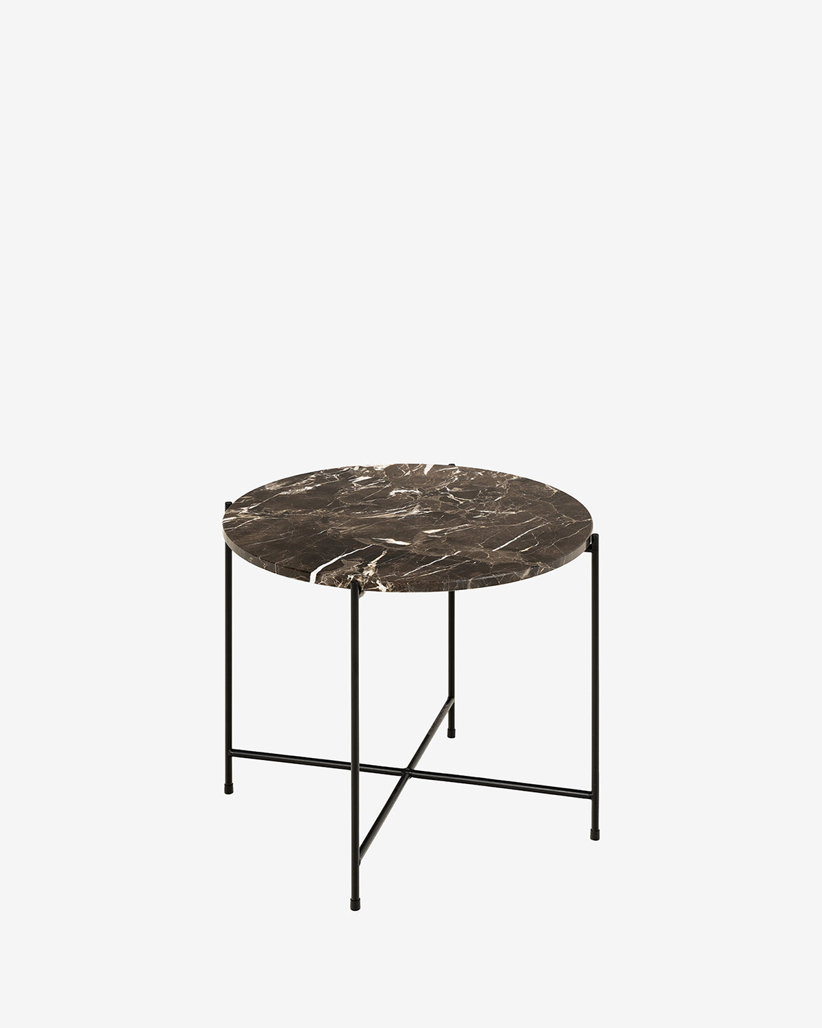 Light sofabordet i brun marmor tilfører varme og eksklusivitet til hjemmet. Bordpladen i brun marmor har smukt farvespil og hviler på et sort metalstel, der giver kontrast og luftighed til designet.