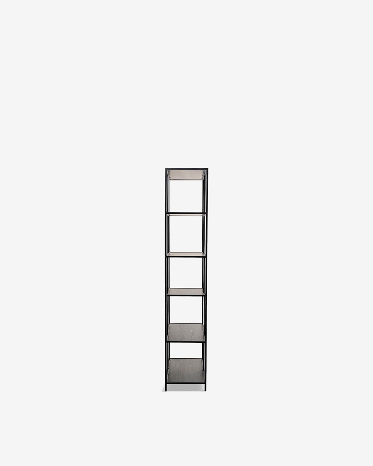 Stor, sort metalhylde i elegant loft-stil. Hylderne med mørk egetræsfiner giver reolen et særligt varmt præg.