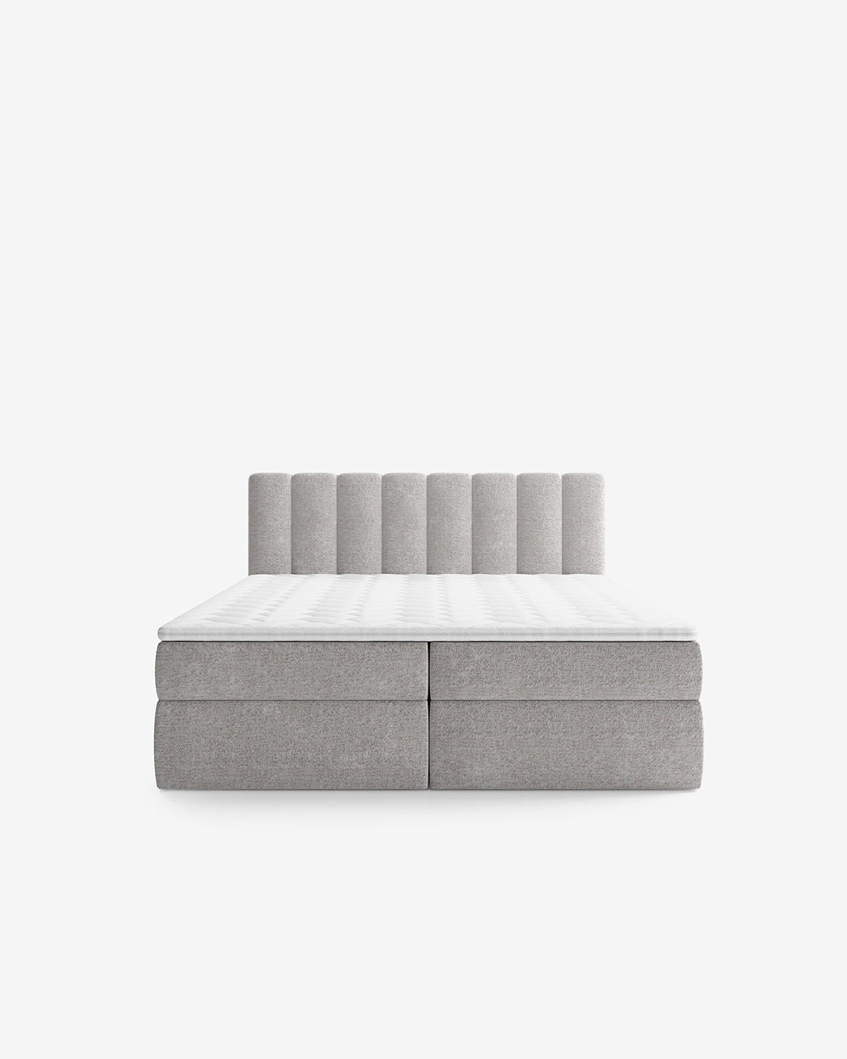 Sengens elegante design går helt til gulvet, og giver et utroligt eksklusivt udseende, der fremhæves af en flot hovedgavl med lodrette syninger.