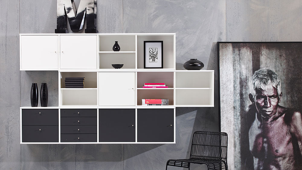 Tidsløs reol med hvid lakeret korpus og antrasitgrå fronter. Reolen er fra vores Mistral byggesystem, hvor du selv kan sammensætte din egen reol efter ønske.