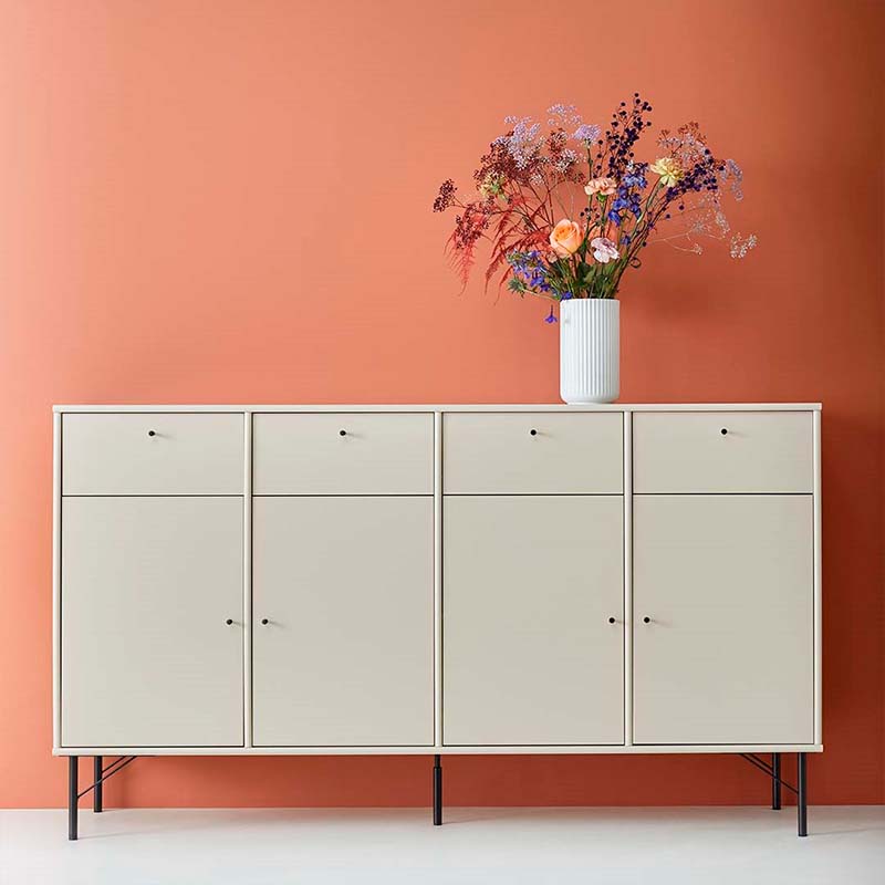 Denne skænk er produceret i lys grå lak, og giver med sine 4 skuffer og 4 låger rig mulighed for praktisk opbevaring i stuen eller på kontoret.