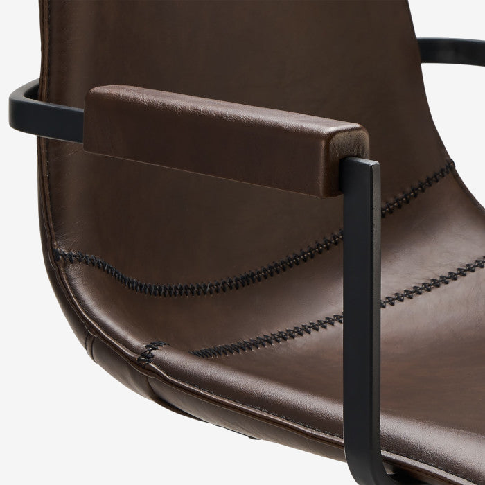 Flot og elegant spisebordsstol i mørkebrun læderlook. Stolen har armlæn så du sidder behageligt, og den er monteret med sorte metal ben.
