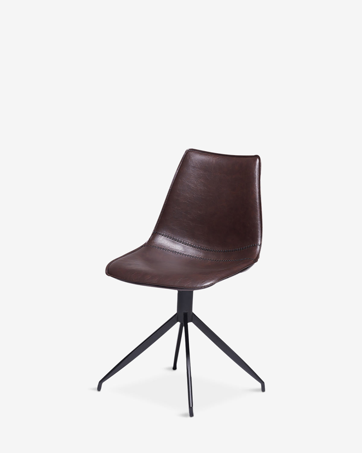 Flot og enkel spisebordsstol i mørkebrun læderlook, monteret med sorte metal ben.