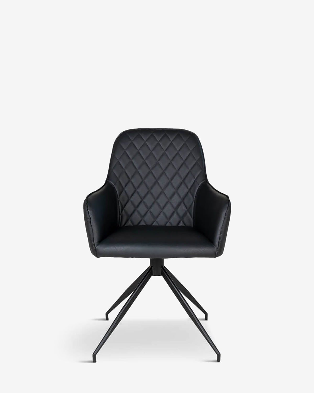 Olly spisebordsstolen er betrukket med sort tekstil læder og den har flotte syninger i ryggen i harlekinmønster, samt drejestel i sortmalet metal.