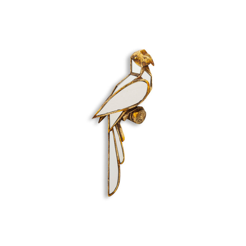 Papegøjens konturer er skitseret i guld, mens spejlglasset kaster lysrefleksioner ind i rummet.
