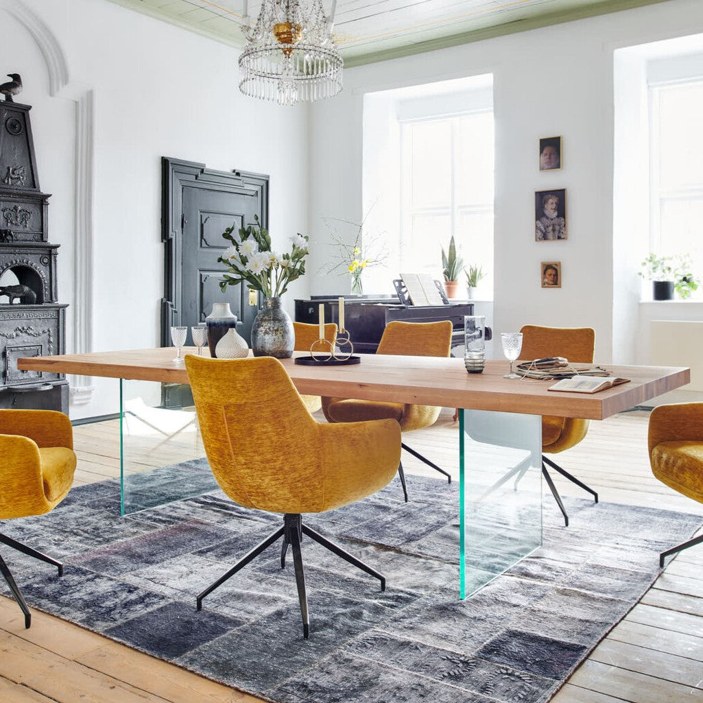 Bordpladen er fremstillet af massiv eg, der emmer af varme og naturlig elegance. Den smukke træstruktur i den mat lakerede overflade fremhæver det unikke i hvert bord og sikrer, at ingen to borde er ens. Den specialdesignede form på bordpladen skaber en dynamisk balance mellem det klassiske og det moderne.