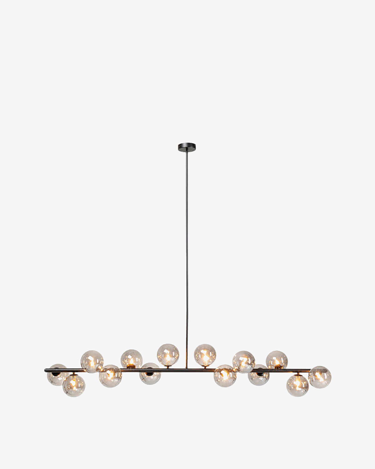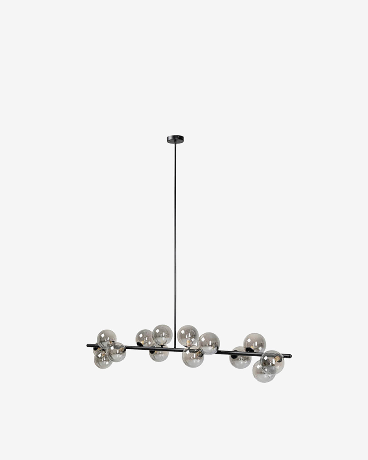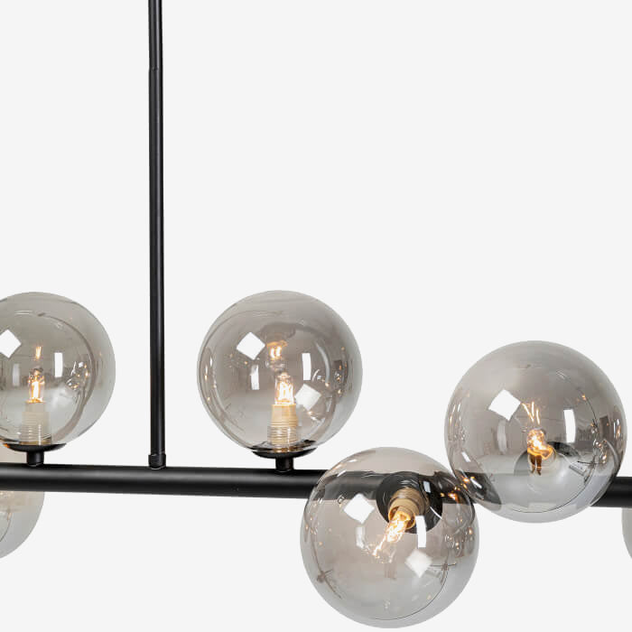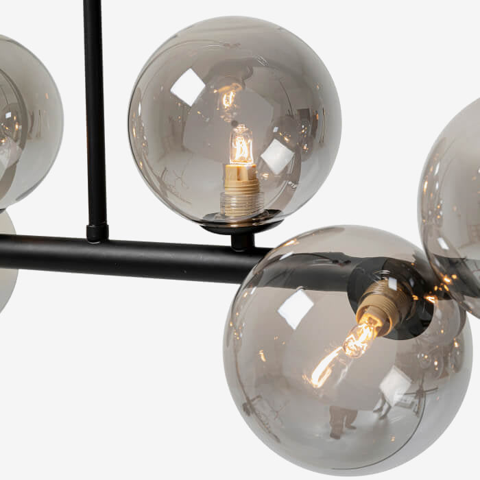 Den æstetiske designerlampe er lavet af pulverlakeret stål der er malet sort, og er udstyret med 14 mundblæste glaskupler.