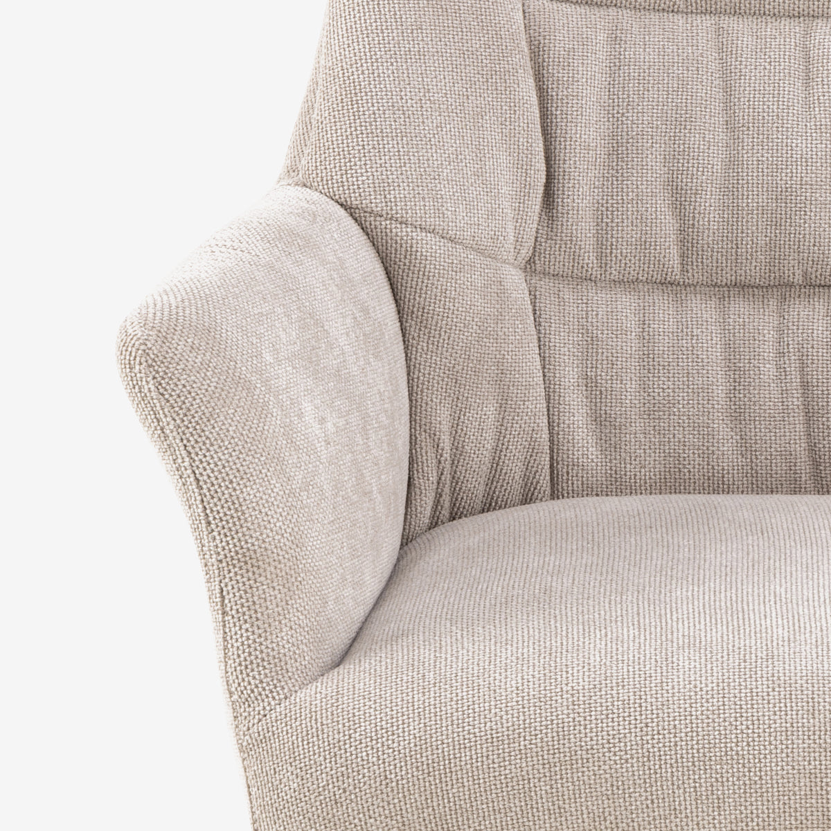 Sorto spisebordsstolen kombinerer stilrent design med høj siddekomfort. Stolen er betrukket med et blødt beige stof, der tilfører varme og et moderne udtryk til dit spiseområde. Armlænet giver ekstra støtte, mens det sorte drejestel tilføjer både funktionalitet og et elegant, udtryk.