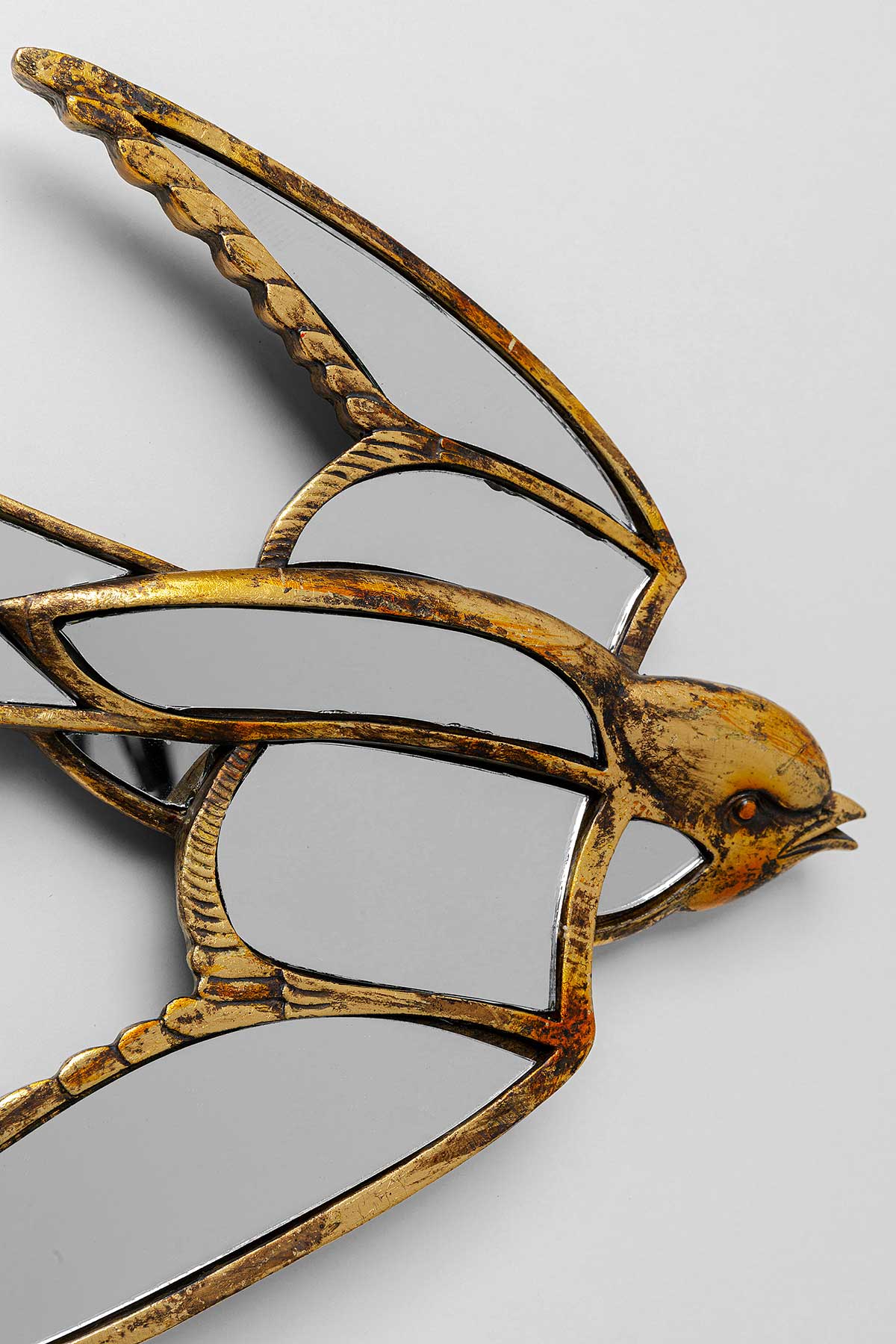 Svale vægspejlet er formet som en flyvende svale og tilfører væggen et let og dekorativt udtryk. Den gyldne ramme fremhæver de elegante linjer og giver spejlet et varmt, eksklusivt præg, der passer smukt ind i både moderne og klassiske hjem.