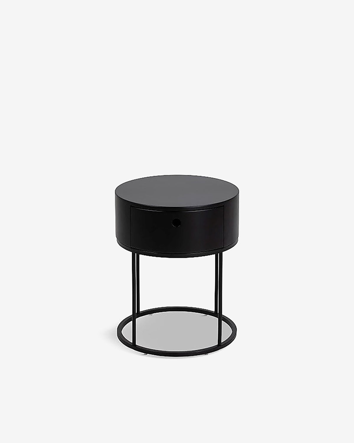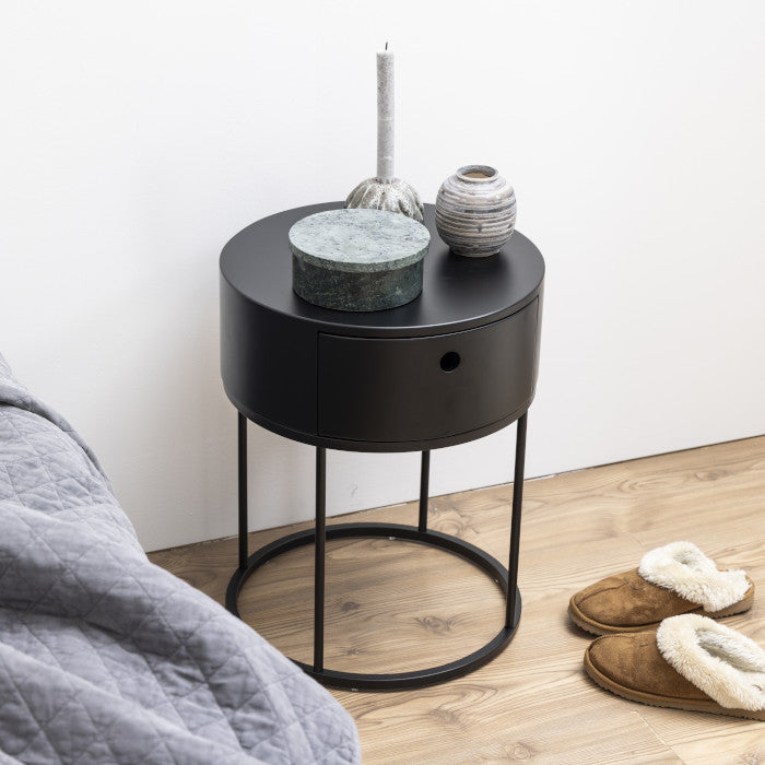 Stilrent, sort rundt sengebord med mat sort metalstel. Sengebordet har en charmerende skuffe til opbevaring.