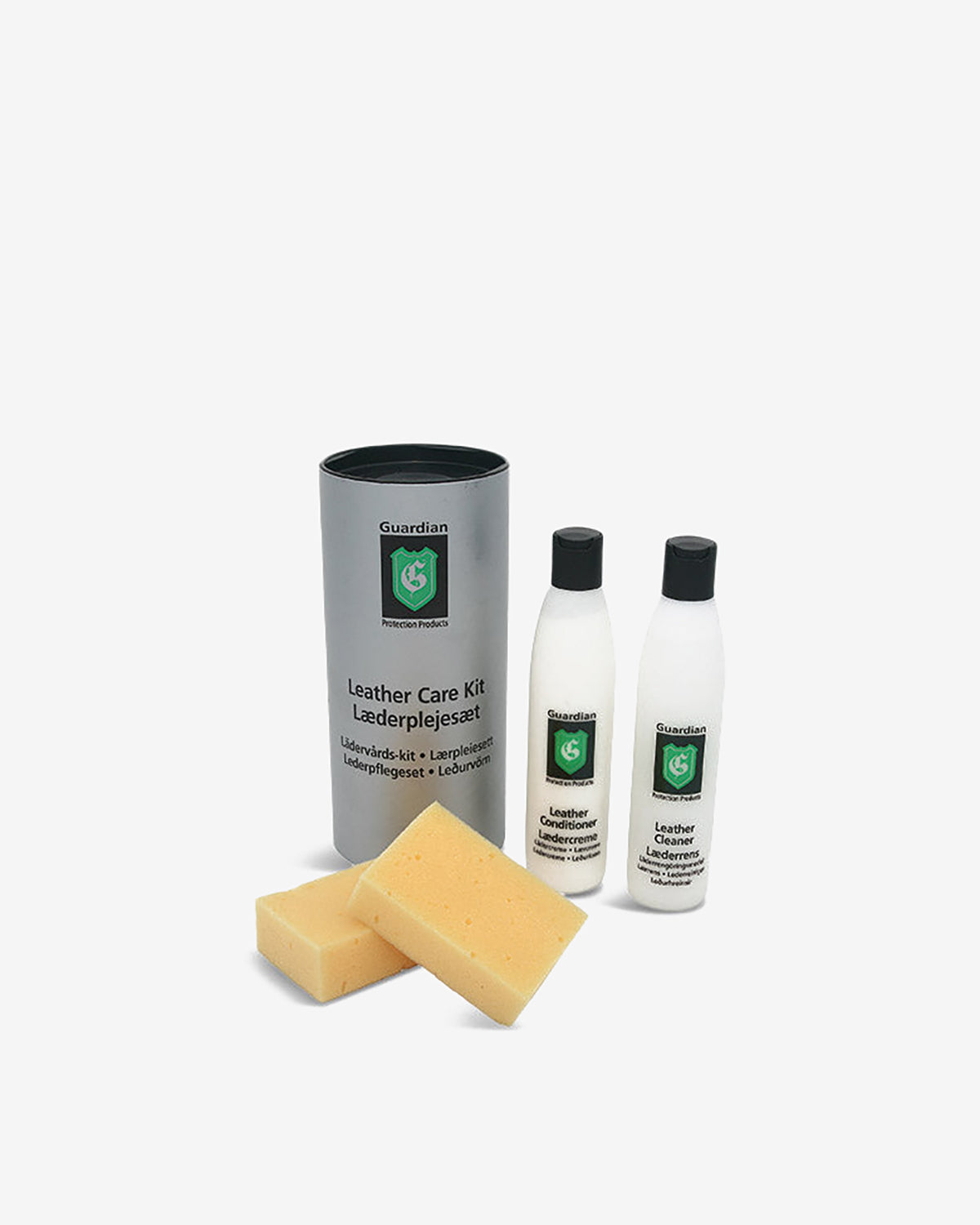Guardian læderplejesæt indeholder alt nødvendigt udstyr til vedligeholdelse af anilinlæder og sikrer lang levetid.